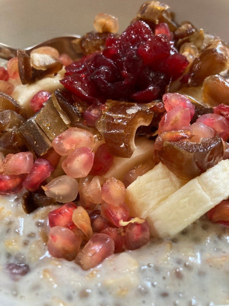 This Christmas-y breakfast was full of natural vitamins too: organic oats, plant-based milk, chia seeds, dates, pomegranate and cranberries.