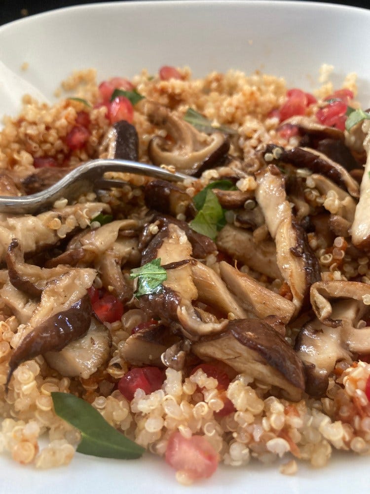 Those little pomegranate jewels seem to give any dish a Christmas-y feel. This one’s another multivitamin treat. Shiitake mushrooms with quinoa and Thai basil from a pot that’s been brought in to stay frost-free this winter. First time we’ve managed to keep basil alive!