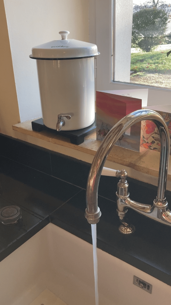 This is where the filtered water came from. We’ve had an Ecofiltro clay pot with its stainless steel casing, for 18 months now. No plastic, no electricity, just naturally cleaned water, with 99% of the ‘nasties’ removed.