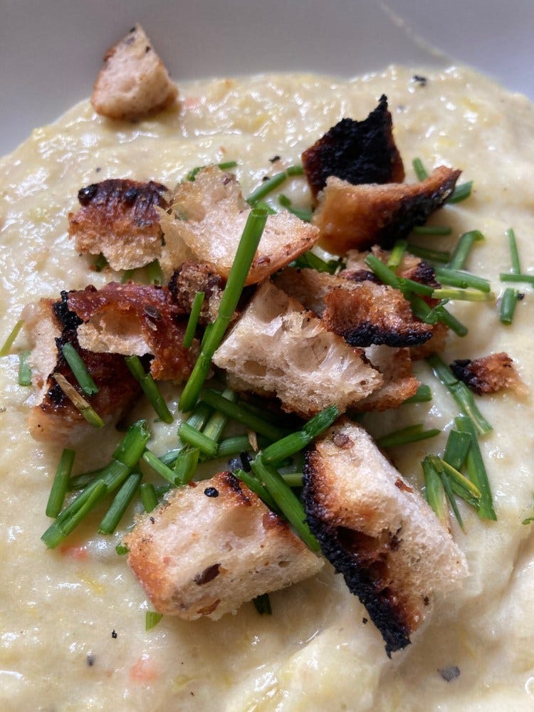This was a simple healthy soup: Leeks, potatoes, vegetable stock, cooked until softened. Then blended, soy cream added and topped with day old baguette and chives from the garden.