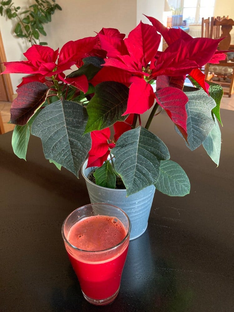 Juicing’s been a habit for many years now. This one’s on trend with festive times: Beets, lemon, apple, turmeric, ginger and filtered water.